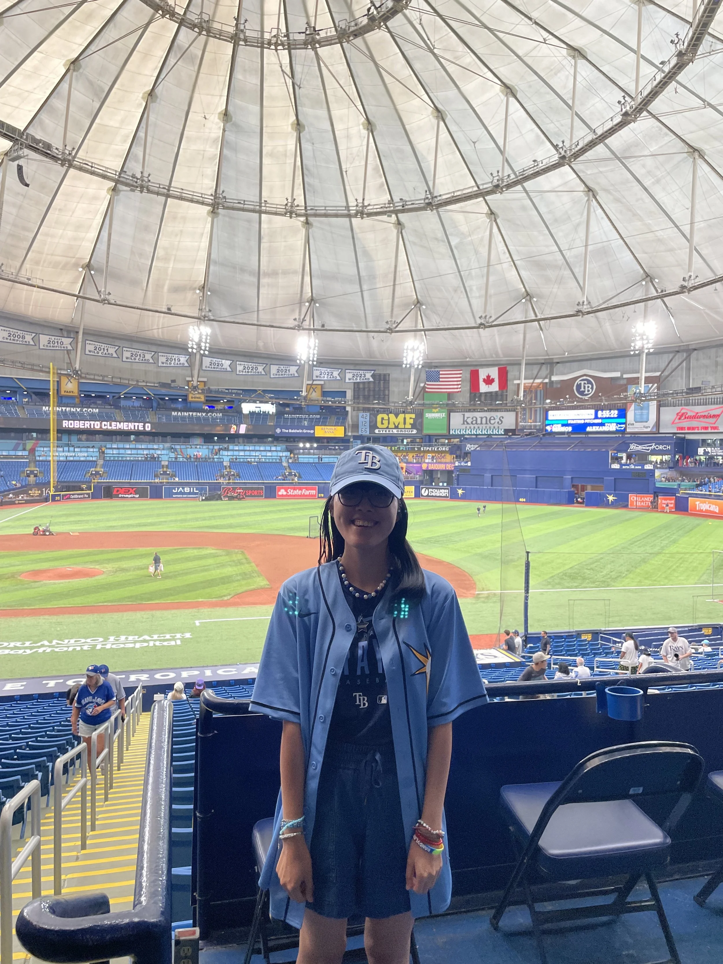 Some of my best memories are from this last trip to the Trop, which happened to be only a week before Hurricane Helene hit Florida. With kind invitations from fellow Rays fan Zoe Hummel, I had the opportunity to sit in the Home Plate Club for two games—that is the closest I’ve ever been to the action at a baseball game. And even though I had seen the roof lighting the year before, I felt more drawn to it this time around for some reason (Devil Rays colors, in particular, look stunning on the Trop’s roof).